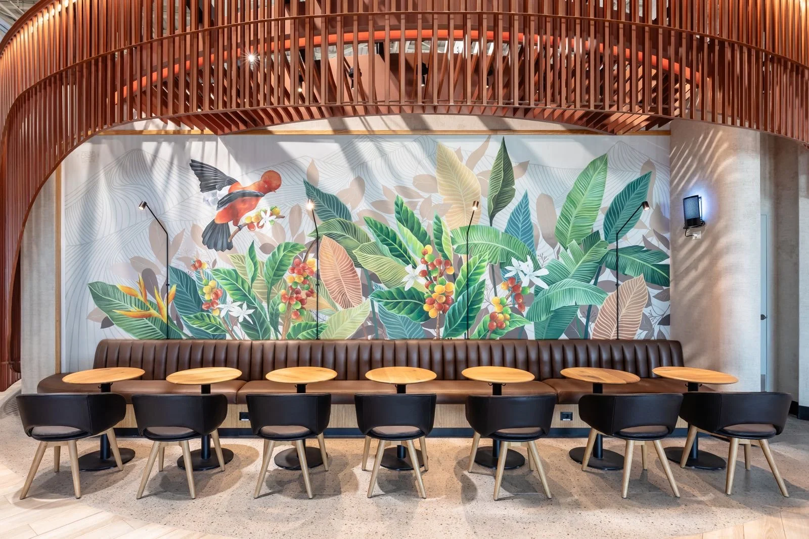 In a circular footprint, we designed and fitted a fully functional café within just 113 sqm, maximizing efficiency without compromising comfort. Located in a boarding zone with a projected flow of 8.2 million passengers annually, the space is strategically positioned to capture travelers’ attention and invite them in. Part of the airport’s new expansion—featuring luxury retailers, hotels, and duty-free shops—this distinctive circular kiosk stands out as a bold and memorable landmark in the terminal.